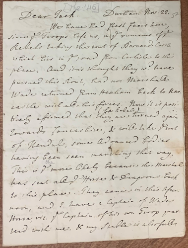 Letter from Thomas Sharp at Durham to his son, concerning Jacobite rebellion, November 1745