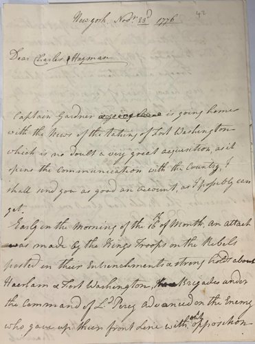 Letter from Henry Rooke to his brothers Hayman and Charles, giving an account of the capture of Fort Washington during the American Wars, 1776
