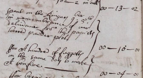The Gunpowder Plot was a failed attempt to assassinate King James I of England during the Opening of Parliament in November 1605. The plan was organised by Robert Catesby, a devout English Catholic who hoped to kill the Protestant King James and replace him with his daughter, Princess Elizabeth, and thereby establish Catholic rule in England (his plan half-worked, for Elizabeth’s grandson later became George I). There were 13 plotters in total, the best remembered being Guy Fawkes. After the plot failed, the conspirators were all caught or killed and after a trial the survivors were sentenced to death – by hanging, drawing and quartering (a nicety here was that prior to drawing they were castrated). In January 1606, Parliament passed the Observance of 5th November Act, making public thanksgiving for the gunpowder plot’s failure an annual feature of English life, with church ministers having to hold a special service reading the text of an approved sermon on 5th November. The Prestbury Churchwardens accounts for 1684 records 14s (£83 today) being spent on bellringers and wood faggots for a bonfire to commemorate ‘the papists horrid powder plott’.