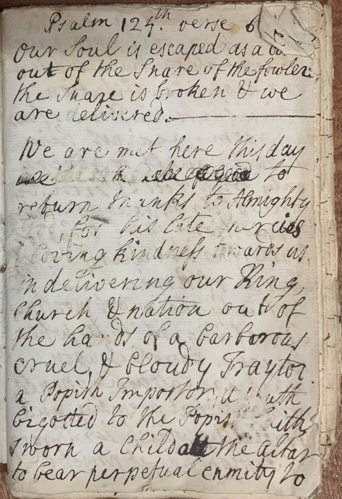 After the collapse of ‘The Fifteen’ rising, churchmen all over the country preached sermons from the pulpit giving thanks for the collapse of the rebellion. It isn’t known who wrote this sermon, but it comes from the Dursley area. It gives thanks for the country's deliverance from the "Popish Imposter" and the "suppression of this late unnatural rebellion." It is a vehement anti-Catholic hell-fire speech, and later, one epic sentence describes the Young Pretender as “a youth taught to govern only with a rod of iron, force of arms, excommunications, Inquisitions, fire & faggots and all the artilleries of the church of Rome.”