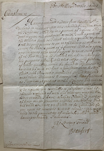 The Glorious Revolution was the series of events that led to the deposition of James II and the installation to the throne of his protestant daughter Mary II and her Dutch husband, William of Orange. The invasion came about due to the need to ‘protect the Protestant religion’ and the threat of a Catholic heir to the English throne (James’ son, James Francis Edward Stuart was Catholic) as well as the possibility that James would ally with France against the Dutch States. William landed at Torbay unopposed with 20,000 men and made his way to London slowly waiting for James’ rule to collapse and for him to flee – which happened within the month. The county’s involvement came from the County Militia and the Duke of Beaufort – who was a staunch supporter of James II. In October 1688, James wrote to Beaufort informing him to gather forces to defend the county. Beaufort subsequently wrote to his officers to raise the Foot Militia ‘upon this intended Invasion’ – ordering them to gather at Gloucester, Sodbury and Stow. He also ordered that as well as raising the regular militia, ‘any person of what quality so ever be found to endeavour the raising of men without a commission from His Majesty that such persons forthwith be seized & secured with their adherents & accomplices’ – essentially conscripting men into the militia against their will.