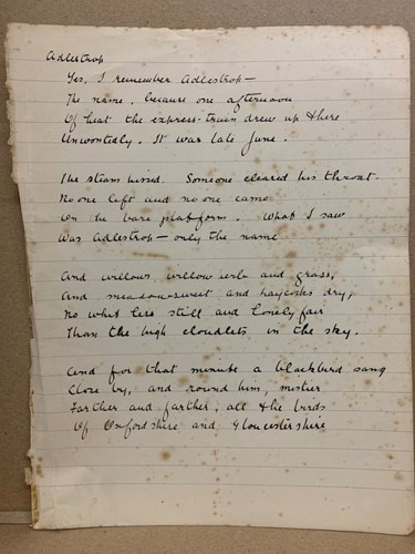 This poem – shown here in the handwriting of John Haines – was based on a railway journey from Paddington to Malvern that Thomas took on 24 June 1914, during which his train halted briefly at Adlestrop station. Thomas was new to writing but recorded the occasion on the day of the journey, noting down the mai