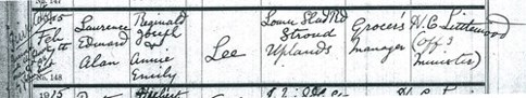 Baptism of Laurie Lee, poet and author, 1915