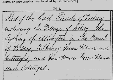 The enumerators were free to collect census returns however they wanted although they did have to record the route that they took. This information was recorded at the start of each enumeration book in a box entitled ‘Description of Enumeration District’. Some routes are straightforward, but in rural areas the description might simply read ‘The whole of the parish of …’. This example for Bibury is typical and doesn’t really give the reader an idea of how the enumerator went around the parish.