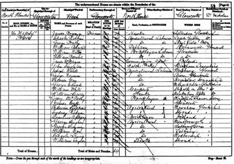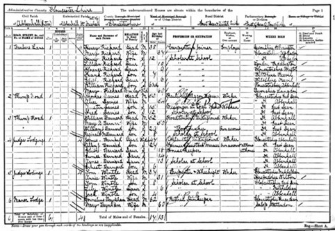In rural locations, the size of farms was usually given in the ‘rank, profession or occupation’ column of the farmer, as this example from Arlingham the 1881 census – where farms of 10 and 18 acres are listed. These also usually gave the number of men that the farm employed in the case of the 18-acre Warth Farm run by Henry Merrett shown here, the workforce comprised a boy and 3 labourers (one of whom was the farmer’s son-in-law). Also of interest in this census is John Barnes, whose occupation was given as ‘Engine driver traction’.