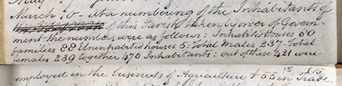 March 10 – At a numbering of the Inhabitants of this parish taken by order of Government the numbers were as follows: Inhabited Houses 80 families 88 Uninhabited houses 5: Total males 237. Total females 239 together 476 Inhabitants: out of these 421 were employed in the business of Agriculture & 55 in Trade.