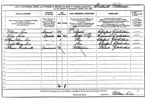 Census returns for boats and ships followed the same format as those on land. This return for the canal barge Frederick Williams, a canal boat based at Brimscombe port on the Thames & Severn Canal shows that her Master was William Rice and onboard with him was his wife, Eliza and their young sons, Thomas and Joseph, together with Thomas Blinkworth, a waterman who was the deckhand.