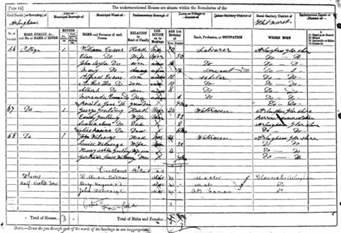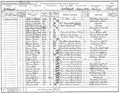 This column is probably one of the best aspects of the census. There are around 1,333,792 occupations given in the 1881 census and they range from an Abecedarian (an alphabet teacher) to a Zythepsarist (a type of brewer). This example, from the 1881 Arlingham census has scholars, a stay maker, laundress, carpenter, carpenter’s wife, grocer, grocer’s assistant, waterman, a pair of ‘former’ labourers, and a retired lady.