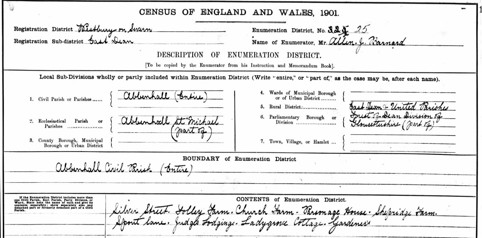 This entry shows Allen J. Barnard in the 1901 census, living at the Judges Lodgings just above Abenhall on Plump Hill. Interestingly, this shows his father as James Barnard but Allen’s baptism which took place at Abenhall Church in 1874, shows his parents as Willan and Mary-Ann Barnard.