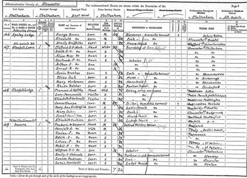Upper class ‘town houses’ tended to operate with fewer staff – this is from the All-Saints area of Cheltenham centred on Pittville Circus. It was realm of retired army officers, lawyers and others ‘living on own means’. Most of these houses were run with just the help of a few domestics, typically including a cook, a housemaid and a few others.