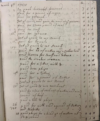 Keeping the household was the one area where women dominated, and they could (and did) exert a lot of control and power when it came to running the house. In most instances, men just signed the cheques or handed over the cash! Taken from the archive of the Hicks-Beach family, this set of accounts from the domestic account book of Ann Beach the younger of Netheravon includes money paid for household goods (sugar, oatmeal, beef, veal, calves head, milk, mutton, butter, etc) as well as snuff, tobacco, ‘bisketts’, a tip to a maid and a washer woman. It also records the lady of the house having to pay her gambling debts – including paying out money to her husband on several occasions!