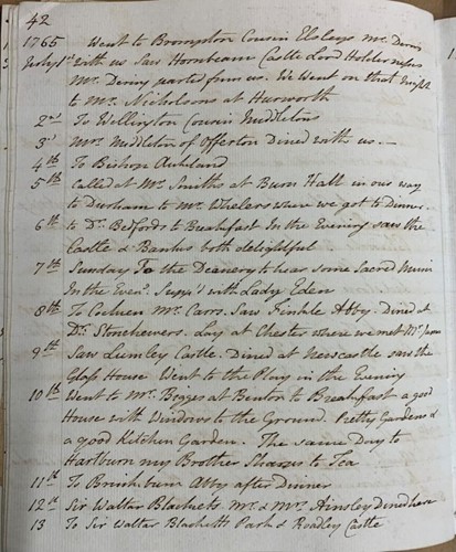 Many upper-class women recorded their lives in diaries. This diary page comes from the Sharp family papers – an archive that spans the late 17th to mid-19th centuries and covers four generations. The family was not particularly wealthy, so sons had to make their own way, while the daughters were married off. Among them was Elizabeth Prowse, nee Sharp, of Wicken Park, Northamptonshire, who kept a diary that was later copied as "Aunt Prowse's diary“. This 1765 entry made by Elizabeth is typical – a listing of visits, teas, dinners and supping…