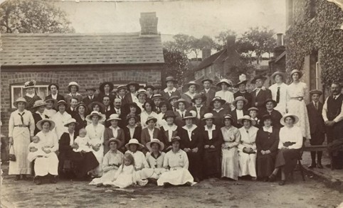 The First World War brought many changes in the lives of women and although it is often presented as having had a wholly positive impact, opening new opportunities in the world of work and strengthening their case for the right to vote, not all the war opportunities were positive or long lasting. The Canary Girls were women who worked in munitions manufacturing trinitrotoluene (TNT) shells during the First World War (1914–1918). The nickname arose because exposure to TNT is toxic and can turn the skin an orange-yellow colour reminiscent of the plumage of a canary. Locally, women worked in National Filling Factory No.5 at Quedgeley, a 308-acre site that began production in March 1917, which at its peak, employed around 6,300 local people of which over 5,000 were women. This photograph shows some of the women munition workers from Quedgeley on a day-trip to The Red Lion at Wainlodes in 1917. Sadly we don’t know why these particular women were on the trip.