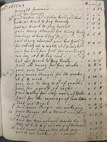 One of the most difficult and dangerous times for a woman in the past was childbirth. Postpartum confinement was (and still is) a traditional practice following childbirth. The seclusion or special treatment lasts for a culturally variable length: typically for one month or up to 100 days. The practice used to be known as ‘lying-in’ and is a recuperative period that centres on bed rest and various care practices. This page – another from Ann Beach's domestic account books – includes references to expenditure on the birth of her daughter Ann, also known as "the Child” in October 1749.
