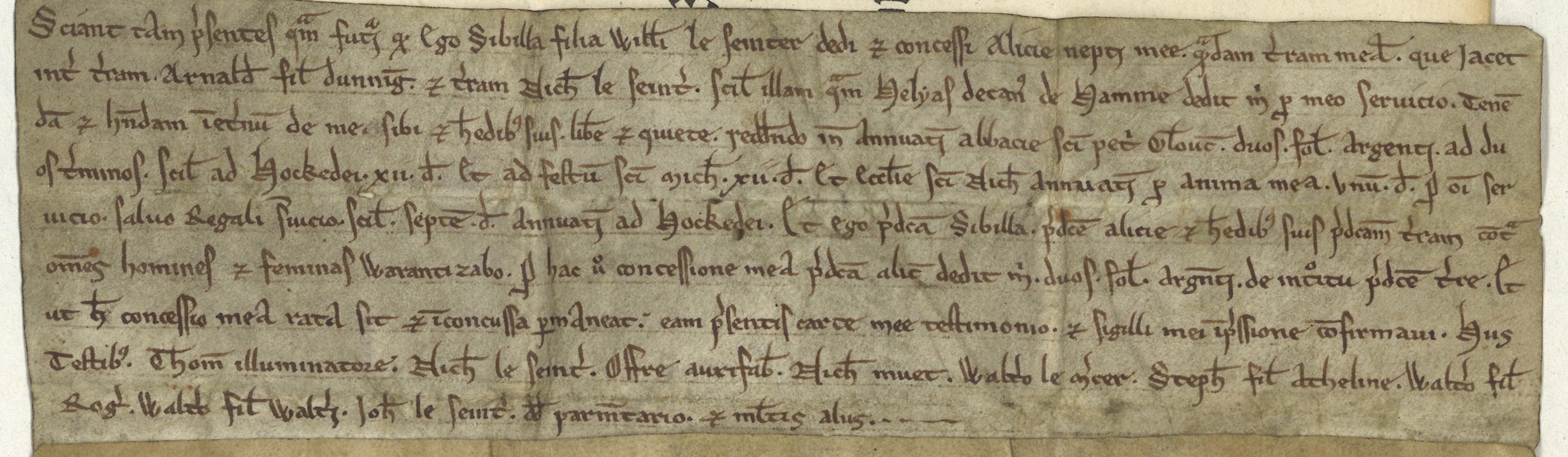 The oldest document in the Archives with a distinct named woman – i.e. not a wife – is dated c.1190 and is for a grant of land from Sibilla, daughter of William the Girdler (beltmaker), to her niece, Alice (which makes her the second named woman!). The land had been given to Sibilla by Helias the Dean of St. Peter’s Abbey for her service. In typical medieval fashion, it doesn't say where the land was except that it lay between the land of Arnald and Nicholas the Girdler (who was also a witness), but we presume it was in the city. There were several witnesses – all male: Thos the Limner (painter) Nicholas the Girdler, Offre the Goldsmith, Nicholas Muet, Walter the Mercer, Stephen son of Atheline, Walter son of Roger, Walter son of Walter, John the Girdler and David the Parmenter (tailor).