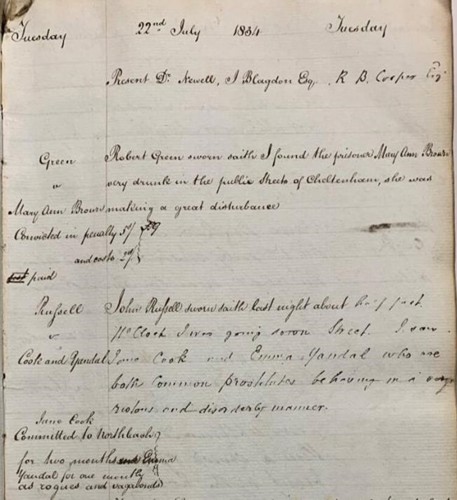 As might be expected in a patriarchal society, it was always the women who got into trouble with the law over prostitution – never their male clients. This is from the Cheltenham Petty Sessions for 22 July 1834 and records the charging and sentencing of two prostitutes, Jane Cook and Emma Yandal for behaving in a ‘very riotous and disorderly manner’ at 11.30pm. The minutes state that the women were reported by one Robert Green. The entry does not suggest that this man was an officer of the law and so it seems that he was a member of the public. Given the time that he witnessed the women, one wonders what he may have been doing out and about at such a late hour. Was he a potential client that the girls refused? Cook was given two months and Yandal one month imprisonment in Northleach Gaol, both being classed as ‘rogues & vagabonds’.