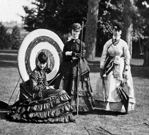 Until the late 1800s, opportunities for women to take part in sports were limited. The main sports were those that required little physical exertion such as croquet, bowls or – as seen here – archery. Taken at Forthampton House, this shows Mrs J R Yorke, Madam de Brienen and Mrs Langhorne at archery practice at Forthampton Court gardens, around 1870. Archery was a popular female sport because women could wear the fashions of the day and it even became an acceptable area to display marriageability! A guide to country pursuits coyly remarked that “few exercises display an elegant form to more advantage”.