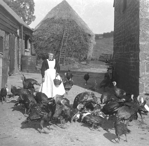 This photograph of a farmer’s wife in her spotless apron feeding turkeys was taken in the farmyard of Charringworth Chase Farm, Charringworth in the early 20th century. While male farmers tended to do field and forest work, look after the large animals and undertake farm maintenance, women did most of the rest! They brewed beer, handled the milk and butter, made cheese, raised small livestock (notably pigs) and poultry, grew vegetables and fruit, spun flax and wool into thread, sewed and patched clothing, and nursed the sick. However, they would also do field work at harvest and haymaking, and in war time, many turned their hands to heavier work such as ploughing.