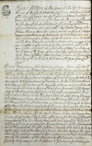 This is part of a transportation bond authorising Mr Heming and Mr Heath to transport Mary Frances and three male convicts on 6 April 1756. Mary was convicted of Grand Larceny (the theft of property valued at over 12d) – after confessing to the theft from the house of Jane Oakley of a mop hat, a cap and pinny and an Indian handkerchief. She was sentenced to transportation to the American colonies for seven years. She would have been taken with the other convicts to either the prison hulks at Woolwich or Portsmouth to await transportation. However, unlike their male counterparts, women convicts were not placed on the hulks. Instead they were held in local prisons – often Millbank Prison (if bound for Woolwich) or Portsmouth Borough Gaol.