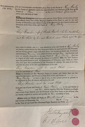 Women tended to be the subject of more parish settlement examinations and removal orders than men – as it was the men that normally left them. This is typical – the removal order of Elizabeth Boucher and her son (Charles, aged 1) from the parish of Kings Stanley to the parish of Cam in 1848. The family had moved to Kings Stanley but Elizabeth’s husband had then deserted her and, without any means of support, she had been forced to turn to the parish overseers for help. After a settlement examination, they applied for the removal order to send her from Kings Stanley to Cam, which became her place of legal settlement. By this date, this meant Elizabeth and her son went straight into Dursley Workhouse.