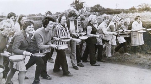 Rather like a Mums’ Sports Day race at school, it’ll be all smiles at the start, but you just know that this Women's Institute pancake day race will be a bloodbath with elbows in faces, trips and shoving! The ladies near or on the verge won’t stand a chance, and within 10 seconds will be in, or more probably over, the hedge!