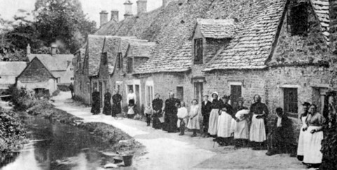 Before the Industrial Revolution, most of the workers in the textile industry were women with hand spinning being having a 100% female employment. Spinning and weaving was carried out under the ‘putting-out’ system, whereby workers would take raw materials from a merchant, spin or weave the materials in their homes, and then return the finished product and receive a piece-rate wage. This is Arlington Row at Bibury c.1890 when the cottages and their attics were let to tenant weavers – some of whom are no doubt seen here. Weavers would utilise water flowing along the mill leat to wash fleeces and the cloth they produced which would then be hung to dry on racks on ‘Rack Isle’ on the left.