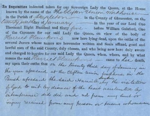 Men feature more in coroner’s records because they were involved in more dangerous outdoor activities. Women experienced more domestic related deaths – falls and burns – but many deaths were recorded as ‘Visitation of God’ – which covered many medical causes. Intemperance was also common – this is the inquest for Harriet Hawkins, 35, an inmate of Clifton Union Workhouse. She died on 26 January 1865 of a Visitation of God because of being ‘Drunk since Christmas’