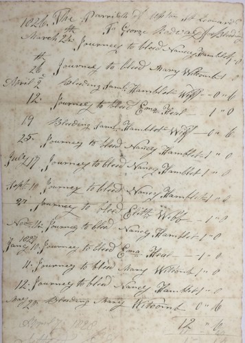 Those who received poor relief were also cared for medically if they fell ill. This page from the Upton St. Leonards overseers’ records for 1826 details visits made by the surgeon George Rodway to the parish of Upton St Leonards for bleeding various women. At this time ‘bleeding’ was thought of as a tonic or ‘pick-me-up’ that was considered beneficial to health. This bill for bleeding and travel expenses for 14 women came to 12s 6d (£42 today).