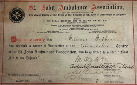Just like today, the St John’s Ambulance Association ran training courses to teach people first aid. This first aid certificate was issued to William Withers by the Gloucester St. John's Ambulance Association in 1896.