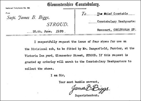 The Bow Street Horse Patrol, founded in 1763, are the oldest police force in the world and merged with the Metropolitan Police in 1836. Gloucestershire Police have probably been using horses since the force’s inception in the 1840s. Horses however need a lot of maintenance – this is a request for the issue of horseshoes for Stroud’s ‘Divisional cob’!