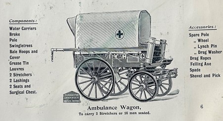 The Gloucester Railway Carriage and Wagon Company built ambulances for military and civilian use alongside their other horse-drawn wagons. This ambulance is taken from their 1900 catalogue and was one of three in the company’s products.