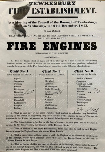 Most town fire brigades had rigid rules for the use of their fire engines. These are the rules in force for Tewkesbury Borough Council’s fire engines in 1843. The main rule was that fire engines could only fight a fire if the parish to which it was going had subscribed – a side effect of this was that it created a local hierarchy that rated certain places above others – here, Twyning was classed above Gotherington which in turn was classed as higher than Conderton! These classes were probably based on the number of buildings and dwellings in each parish. In 1843, a Class No.1 parish was required to pay £48 per annum, a Class No.2 £36 and a Class No.3 £20. All told these fire subscriptions brought in a total of £104 to the borough – around £8,300 today. In addition, each call out was charged at £3 per engine – about £240 today. The rules also give some insight into how the brigade worked, as each engine was dispatched under the guidance of a Borough Engineer and 10 firemen.