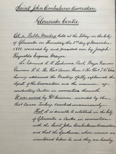 Gloucester’s St. John’s Ambulance Association was established on 3rd November 1881. It formed after a public meeting at The Tolsey that was convened by the Mayor, Joseph Reynolds. The main resolution stated, “That it is desirable to establish in the City of Gloucester a Centre in connection with the Saint John Ambulance Association.” It elected a committee of 10 to run the centre under the auspices of the St. John’s Ambulance Association and appointed a President, Chairman, Treasurer and secretary.