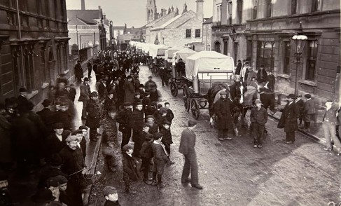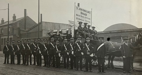 Many local companies had St John Ambulance Brigade units in their strength. This photograph shows the Wagon Works Division of the St John Ambulance Brigade on a recruiting procession for war munitions workers on 2 October 1915. Of interest is the banner on the wagon which proudly states that 35 members of the wagon works unit were already ‘serving with the troops’.