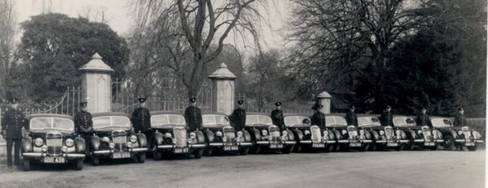 On 15 October 1912, the Chief Constable of Gloucestershire asked the Standing Joint Committee for permission for the Superintendent at Northleach to use a car instead of a horse & carriage. Initially police cars were used only by senior offices but gradually they became an integral part of policing. This picture shows the fleet of Riley patrol cars at Pittville Park in Cheltenham with their drivers in 1946/7.