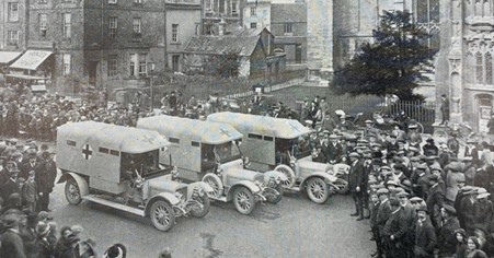 The outbreak of WW1 saw the introduction of motor-ambulance cars, although these were only initially used in Britain as the Army command distrusted them – primarily because they were uncertain of their reliability – and initially the bulk of army ambulance services on the frontline were so wounded soldiers overseas had to endure horse-drawn ambulance wagon journeys. At home however, fundraising from donations and public subscription provided many motor ambulances – such as these new vehicles seen in Cirencester in 1914.