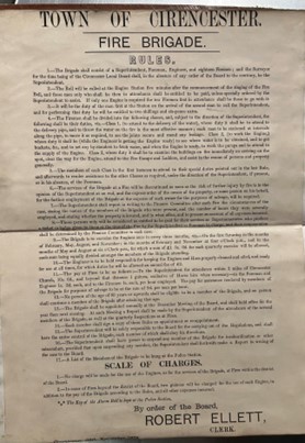 The rules for the Cirencester Fire Brigade show other aspects of working – firstly the brigade comprised a Superintendent, Foreman, Engineer and 18 firemen. When the alarm had been raised, the roll was called 5 minutes later and only men who were present were paid (1s per hour). The first man to arrive would – on the arrival of a second man – call the superintendent….receiving a 2s 6d bonus (£8 today) for doing so! The firemen were also divided into the following classes: