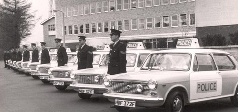The ‘panda car’ refers to small, economical cars often featuring a distinctive black and white livery, that were used for neighbourhood or area policing duties from the 1960s. The name originated because these vehicles, particularly in their early iterations, resembled the giant panda with their black and white body and door markings – though light blue soon replaced black paint. This photograph shows Cheltenham Police Division’s first 'Pandas' outside Talbot House, Cheltenham in 1968.
