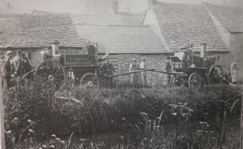 A major advance in firefighting came with the introduction of the steam-powered fire pump in 1829. These horse-drawn vehicles used an onboard steam-engine which powered a water pump. Steam for the pump could be raised to working pressure from cold water in around 10 minutes, which was usually done while the engine was travelling to the fire. Coal for the boiler was kept in a bunker below the front axle. This picture shows two of Stroud Urban District Council’s Merryweather & Sons horse-drawn double-vertical boiler fire appliances on a training exercise at Matthew Grist’s Merrets Mill in Inchbrook (bottom). The only water these appliances had was for the engine’s boiler to power the pump and so for water to fight a fire, they had to use an alternate water source, such as a hydrant, pond or stream – hoses leading to an adjacent pond can be seen here. The hose end had a filter to ensure that debris, frogs and fish didn’t reach the pump. If the water supply for the boiler ran out this would also be taken from the water source.
