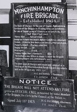 Like other towns, the Minchinhampton Brigade imposed charges for use of the engine. This fascinating notice board shows the scale of charges in 1913: