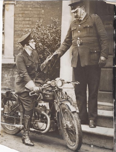 Motorbikes were first used in the early 1920s. This photograph shows Woman Police Constable Janet Gray on her motorcycle receiving instructions from Superintendent Shellswell at Lydney Police Station 1929.