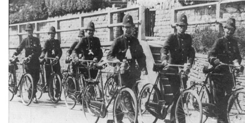 Bicycles came into policing in the 1870s with the introduction of ‘safety bicycles’. They enabled policemen to patrol larger areas, especially in towns and cities. As they had to be able to be used at night the bicycles in this photograph have oil lamps. They are also fitted with a small rear-mounted saddle bag. After a period of neglect, bikes have come back into vogue with the police thanks to their manoeuvrability on crowded pavements and their ability to navigate narrow gaps in congested roads
