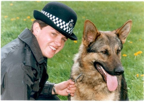 Woman Police Constable Cindy Purnell, first female dog handler in Gloucestershire Constabulary with German Shepherd Charlie, 1990. (Gloucestershire Police Archives URN 533)
