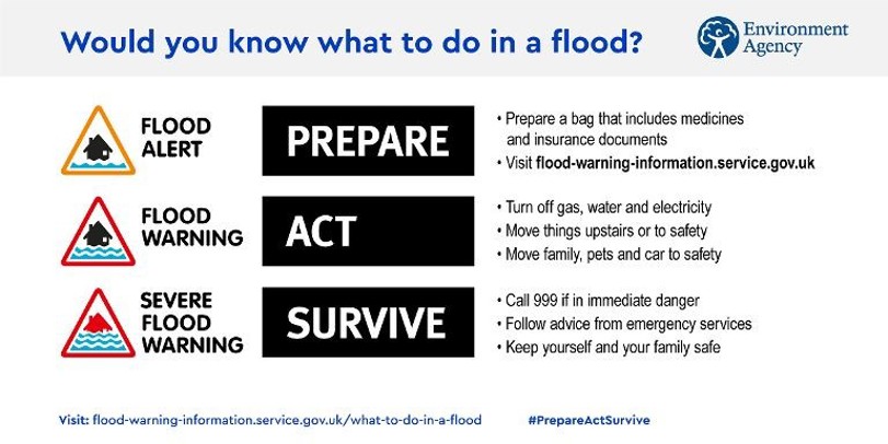 For those at risk of flooding, the Environment Agency has a lot of useful information online to help to plan ahead. There is also a helpful Flood Guide on the County Council’s website with advice to help prepare for before, during and after flooding.