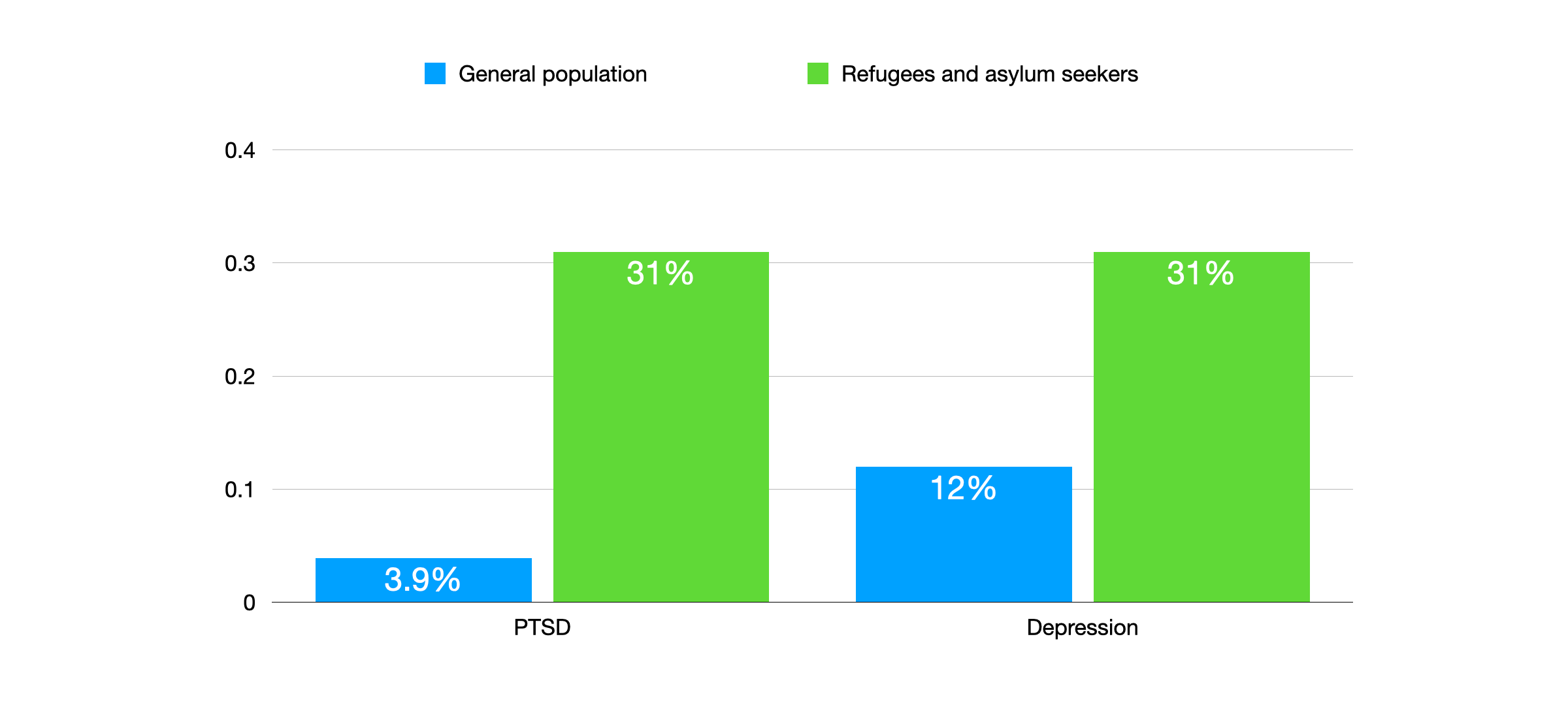 Refugees and asylum seekers are at higher risk of post-traumatic stress disorder (PTSD), depression, and anxiety disorders, with prevalence of PTSD and depression are each estimated to be around 31% in global refugee populations compared to 3.9% and 12% respectively in the general population. Evidence shows that the increased rates of PTSD and depression may continue for many years after they have left their home country.