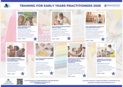 Our centrally held training events are available to all Pre-school and Nursery staff across Gloucestershire. We can provide: