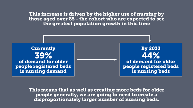 Currently 39% of demand for bed-based care for older people is for nursing care. By 2033, 44% of demand for bed-based care for older people is expected to be for nursing beds.