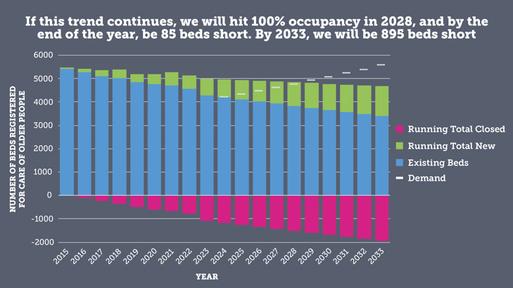 If the trend from 2015 to 2023 continues over the next 10 years, we would expect the number of beds to decline further – leaving us with only 4680 beds in 2033. Even if we were able to hit 100% utilisation of beds, nearly 900 older adults would be left waiting for a bed.