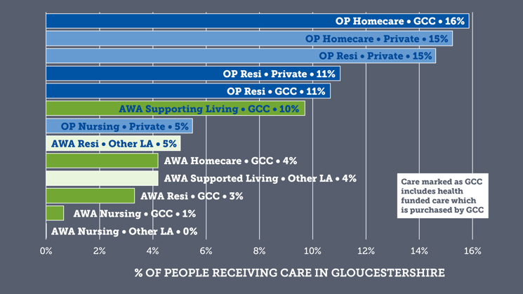 Demand for services does not just come from those who have services brokered by us. There is also a significant private market for older adults care in Gloucestershire and placements made into Gloucestershire by other local authorities for adults of working age. Overall, we purchase 6% of all care – including 52% of care for older people and 63% of care for adults of working age.