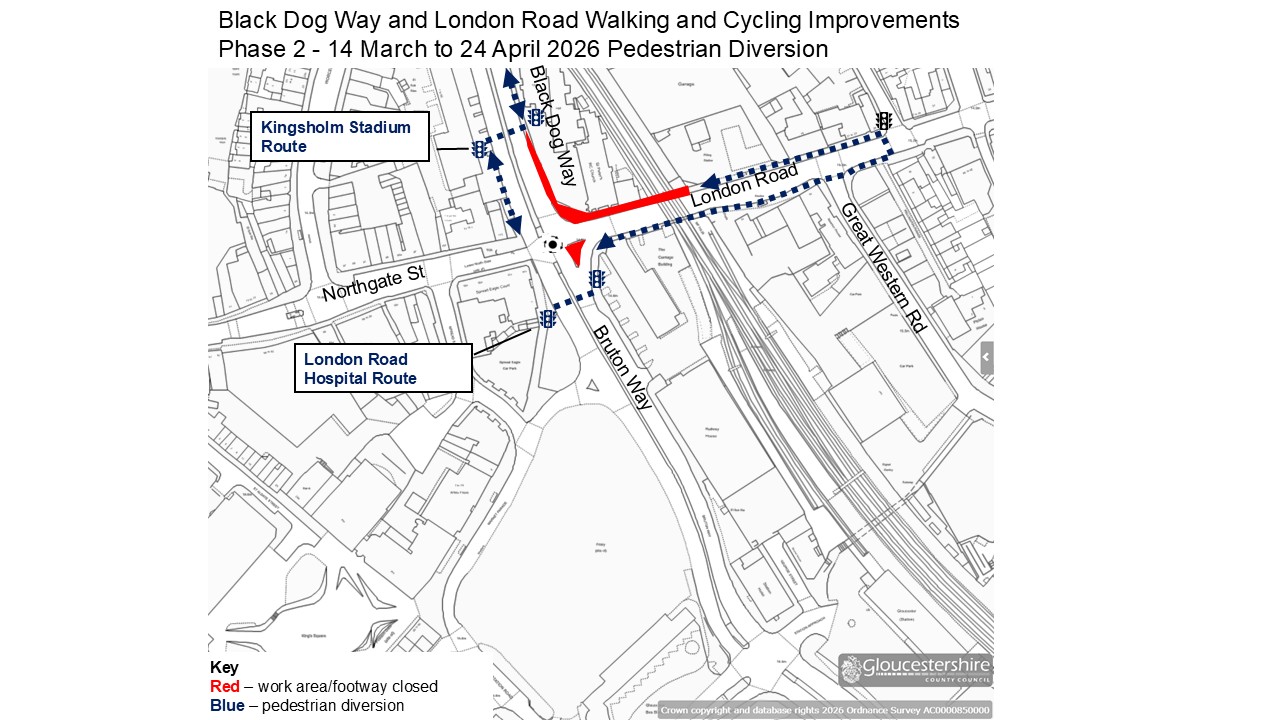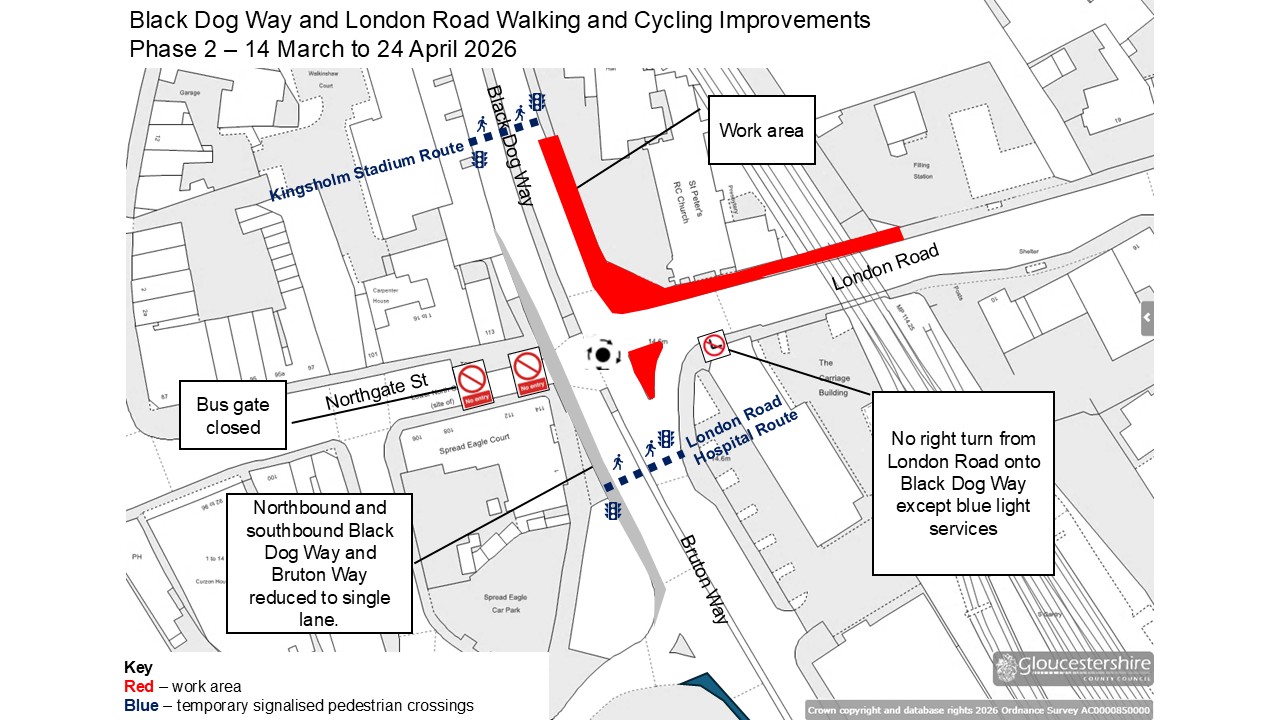 Construction is underway at the Black Dog Way junction, having started on 9 February. A Meet the Contractor event took place on Wednesday 4 February 2026 from 10am – 6pm at Gloucester Heritage Hub, Clarence Row, Alvin Street, Gloucester GL1 3DW.
